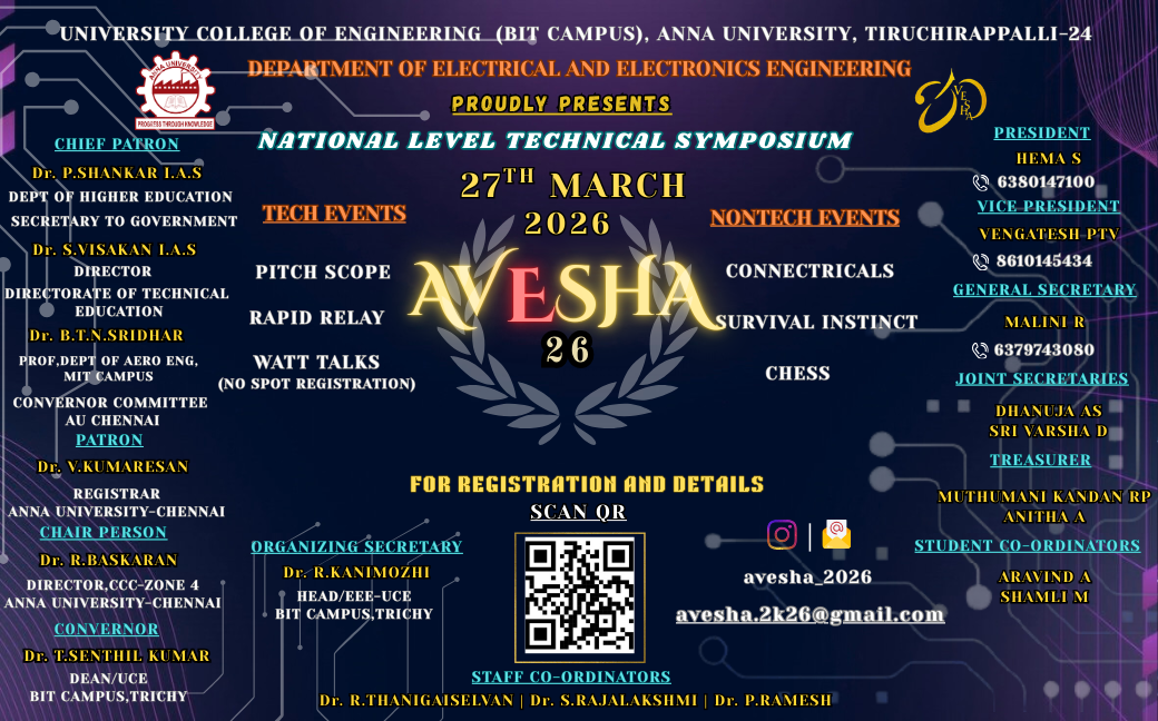 One Day National Level Technical Symposium " AVESHA'23 "- 5th May 2023, Presented by Department of Electrical and Electronics Engineering, UCE-Trichy